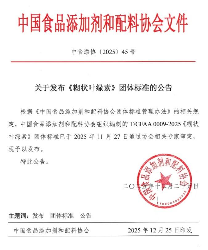 2025年12月25日,《关于发布《糊状叶绿素》团体标准的公告》(中食添协(2025]45号):根据《中国食品添加剂和配料协会团体标准管理办法》的相关规定,中国食品添加剂和配料协会组织编制的T/CFAA0009-2025《糊状叶绿素》团体标准已于2025年11月27日通过协会相关专家审定,现予以发布。