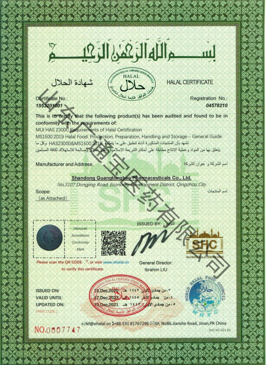 Shandong Guangtongbao Pharmaceutical Co., Ltd. has obtained Halal certification since the end of 1990s, which has played an important role in expanding the international market, consumer groups and consumer field. It also provides more weights for enterprises to enter the world raw material market and participate in international competition.