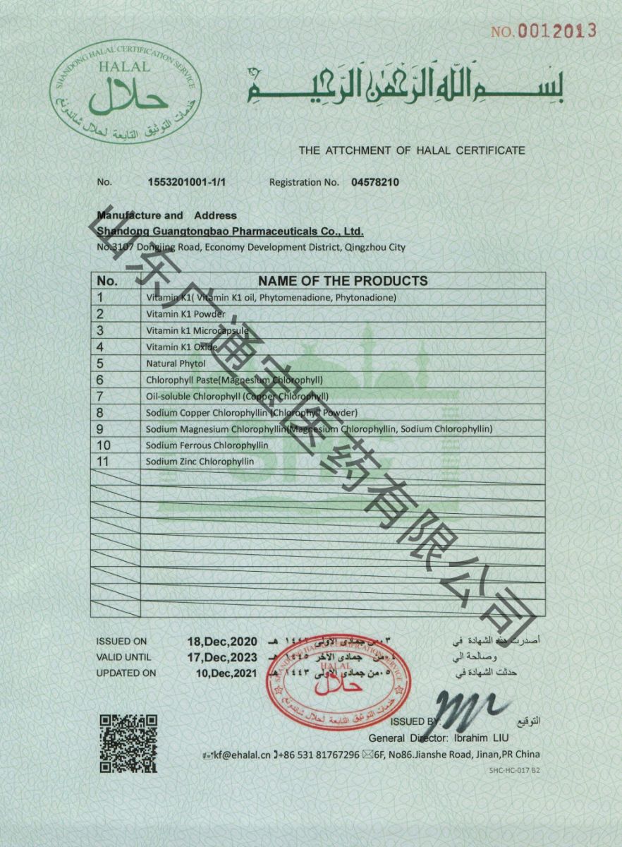 Halal certification for chlorophyll series, vitamin K1 series, natural phytol and other main products of Shandong Guangtongbao Pharmaceuticals Co., Ltd. has been updated again recently.